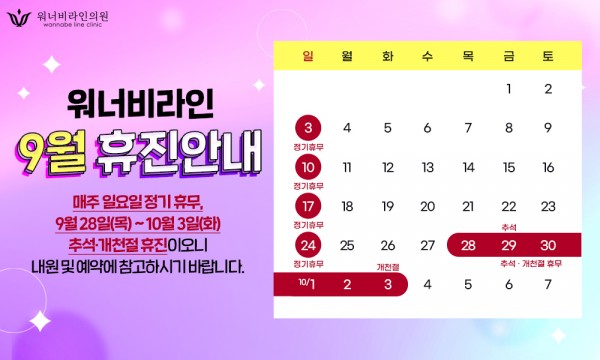 워너비라인 9월 휴진안내 페이지 정보 작성자 최고관리자 댓글 0건 조회 772회 작성일 23-09-20 14:20 목록 본문 워너비라인 9월 휴진일정을 안내해드립니다.매주 일요일 정기휴무9월 28일 - 10월 3일 추석 연휴 휴진 일정을 참고하시어 내원 및 예약에 차질 없으시기 바랍니다.감사합니다. 다음글워너비라인 8월 휴진안내 23.08.01 댓글 0 댓글목록 등록된 댓글이 없습니다.