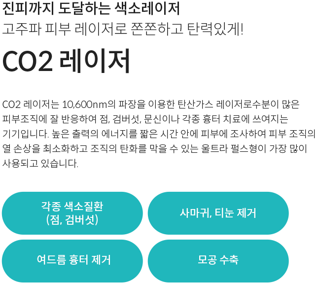 피부 병변을 원하는 깊이만큼 파괴시킬 수 있기 때문에 정교한 치료가 가능하며 점, 검버섯, 색소성모반, 사마귀, 티눈, 비립종, 한관종 등의 치료에 도움을 줍니다.